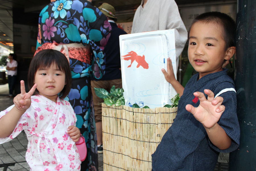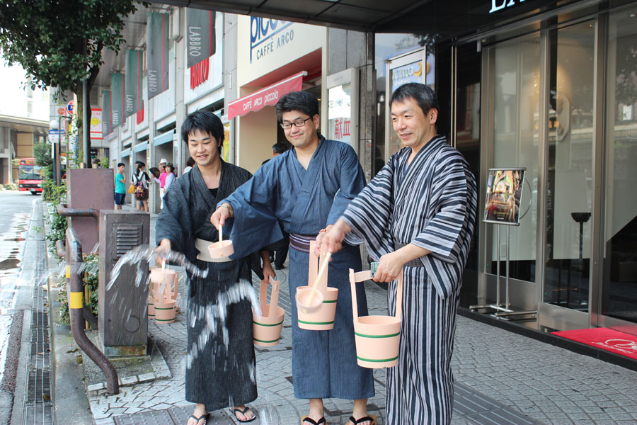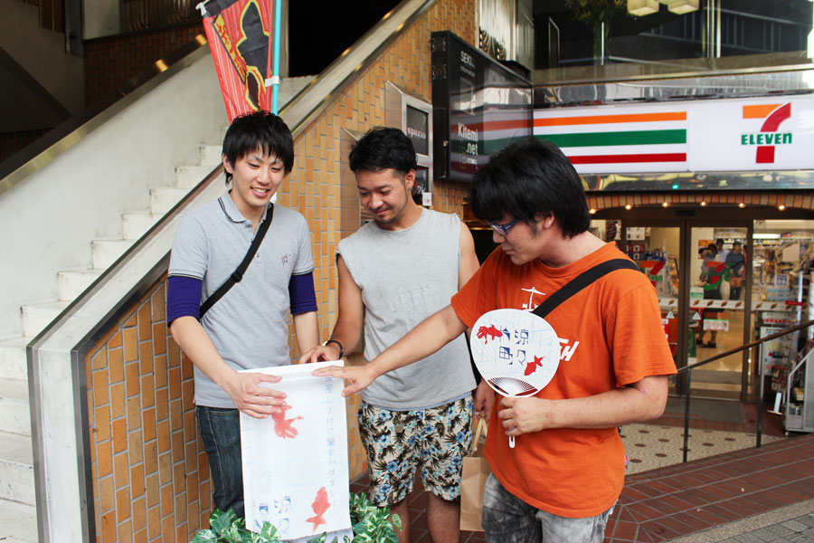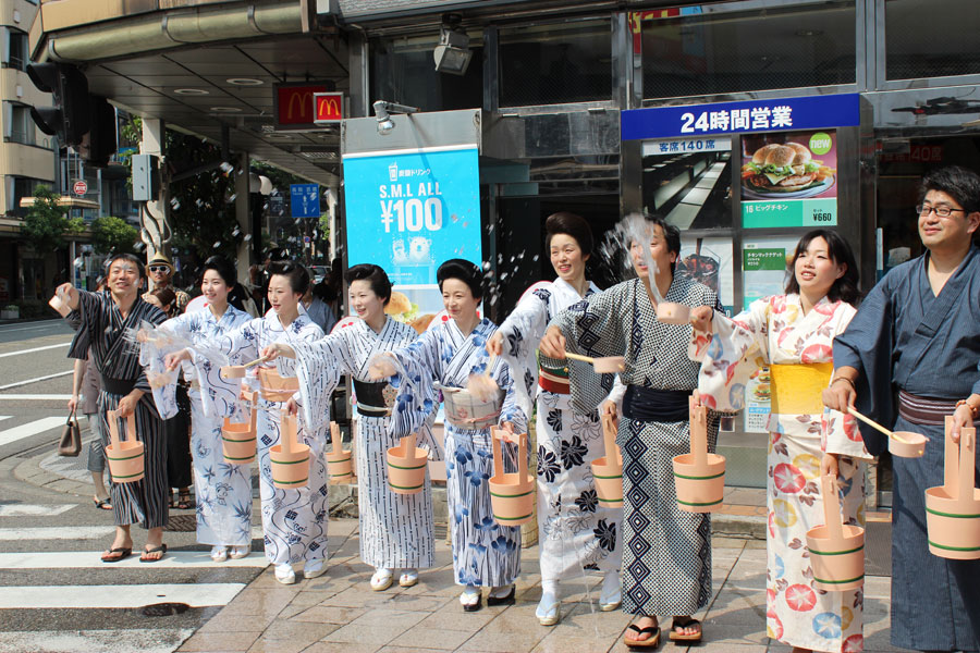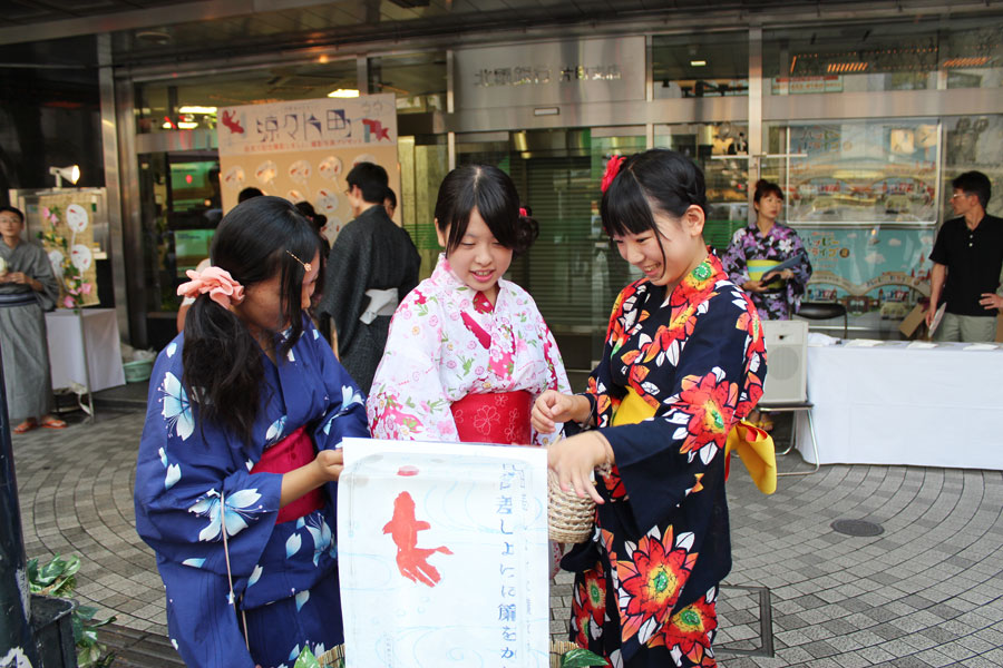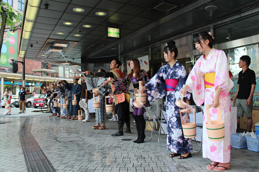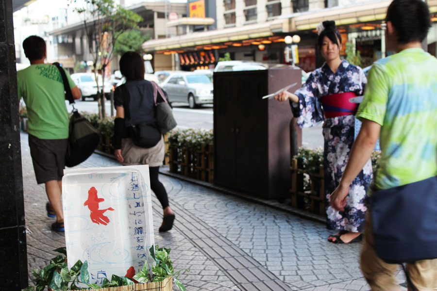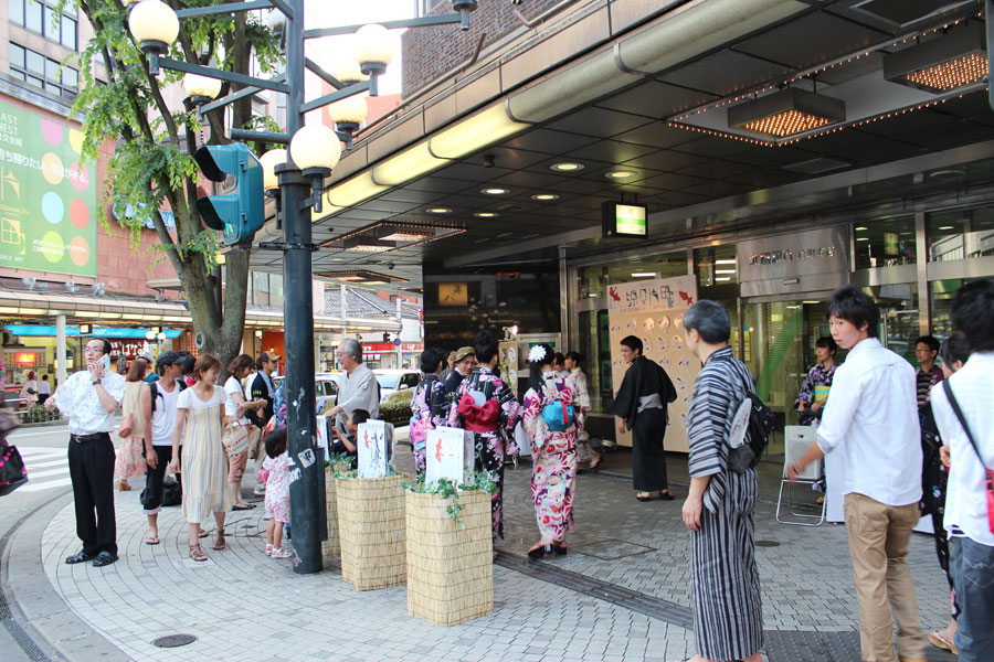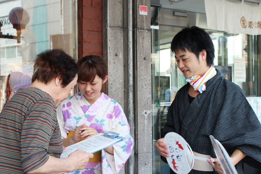 7月最後の土曜日に「片町ゆかたまつり」を行いました。 花火大会の開催日でもあり、ゆかた姿の方が多く行き交う中を午後は片町マクドナルド前で西芸妓衆との打ち水、夕方までの間は国道の融雪装置を使った道路散水、夕方からは片町スクランブル交差点北國銀行前の特設ブースにて、ゆかた姿を写真撮影&プレゼントのイベントを開催しました。通行者の方にうちわの配布も行い、片町を訪れる方々に夏の涼を演出し、憩いや開放感を提供するとともに、全国的に問題となっている夏の節電・省エネについて呼びかけました。