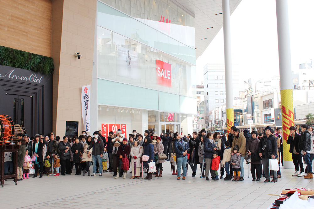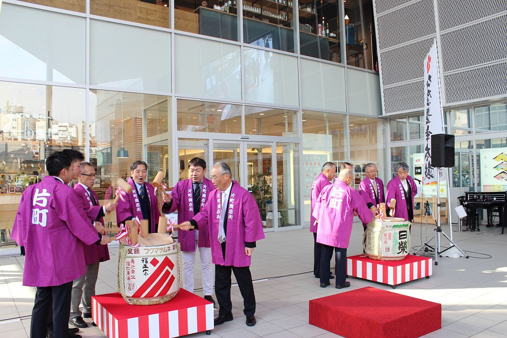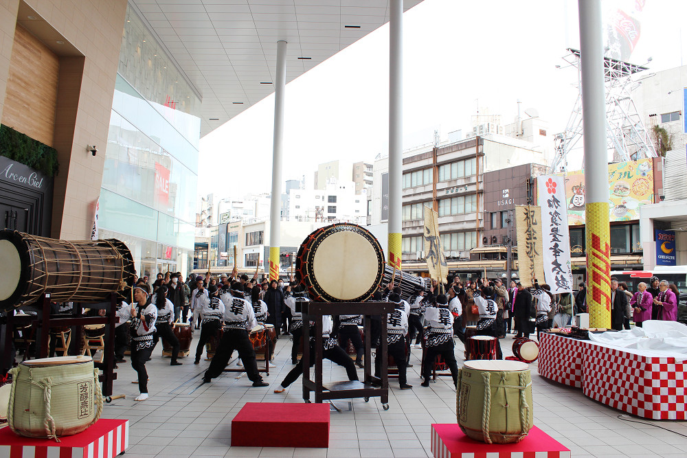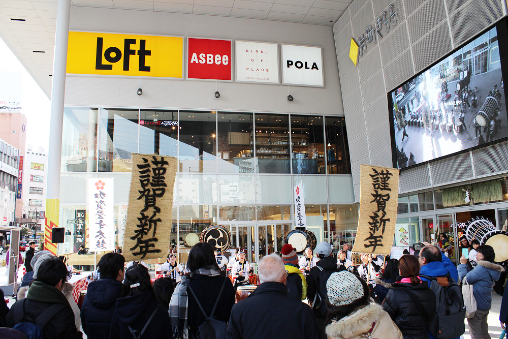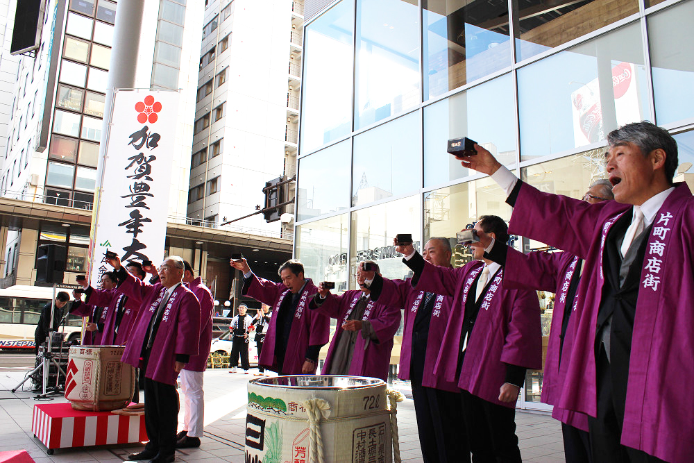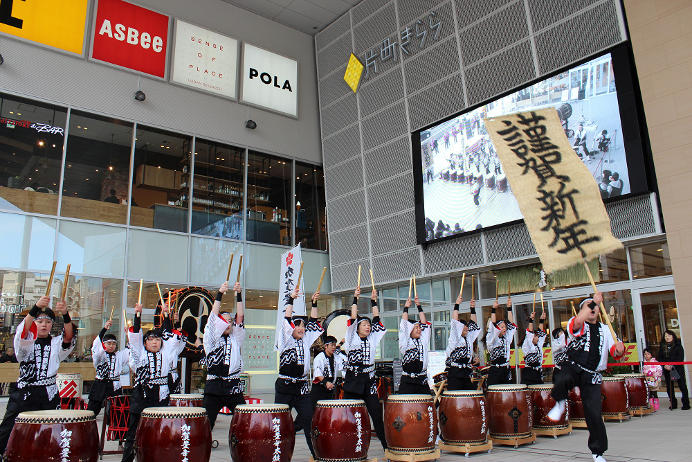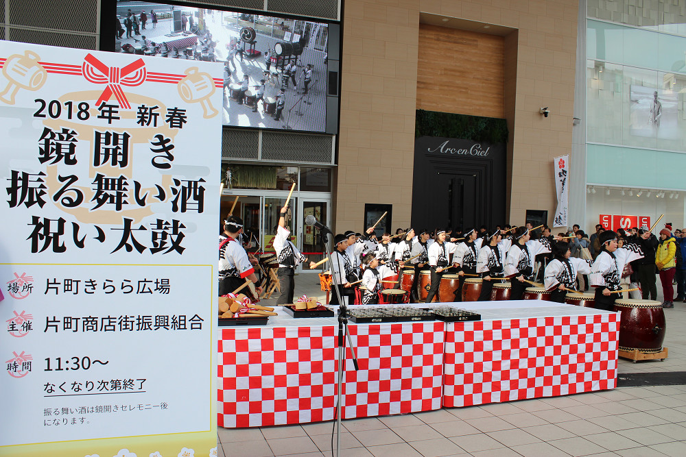 初売り日の1月2日に片町きらら広場にて、「2018年新春 鏡開き・振る舞い酒・祝い太鼓」を開催しました。