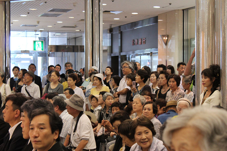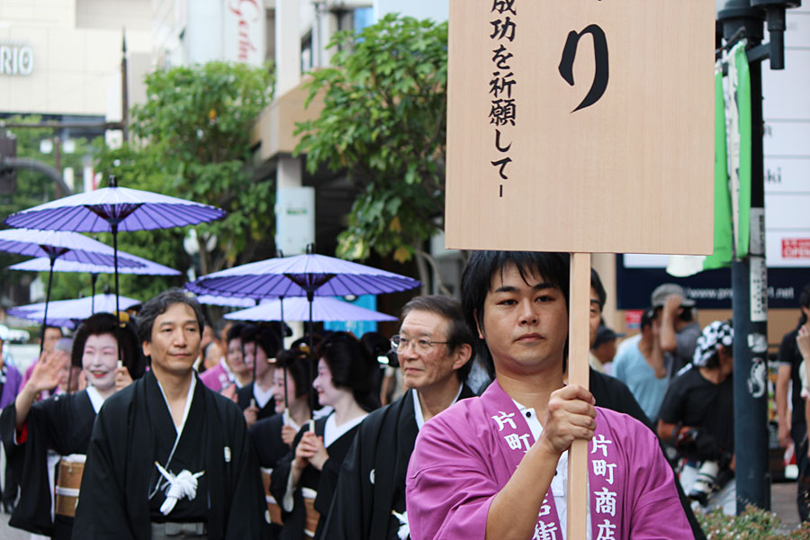 片町と西茶屋街は、犀川を挟んで隣り合う街として、古くから互いの親交が盛んで深い繋がりがあります。花街文化を継承し、金沢の伝統芸能を守り続けている西芸妓衆を応援し、9/20~23に行われる「金沢おどり」の成功と片町商店街の発展を祈願しました。 香林坊アトリオステージでの祈願祭と芸妓衆による伝統芸能「金沢風雅」や「さわぎ」などの踊りとお座敷太鼓の披露の後、香林坊大和前~片町金劇パシオンまでの国道157号線をゆっくりと練り歩きました。 黒留袖姿の芸妓衆はとても優雅で、たくさんの方に華やかな練り歩きをご覧いただきました。