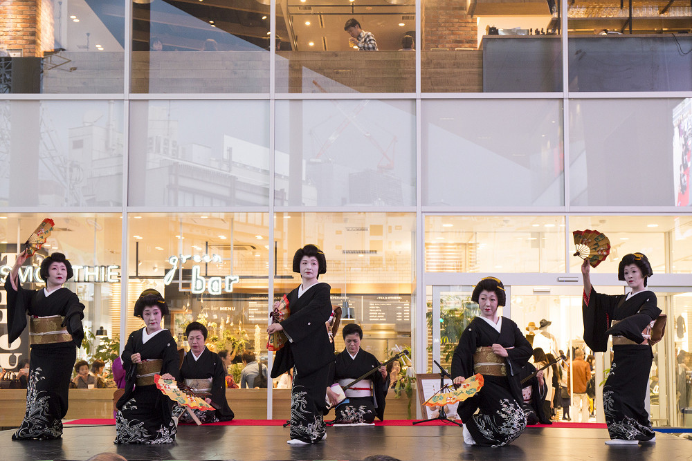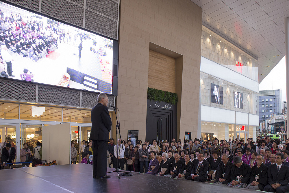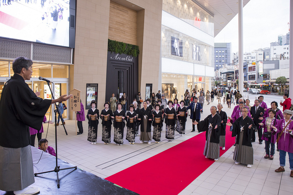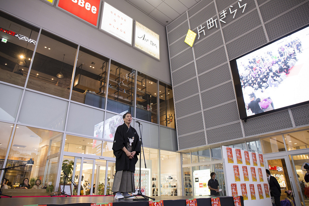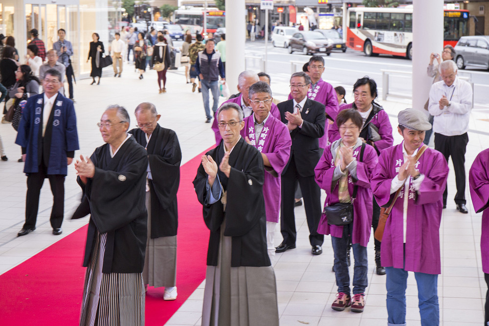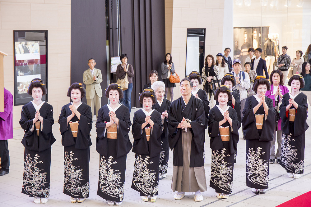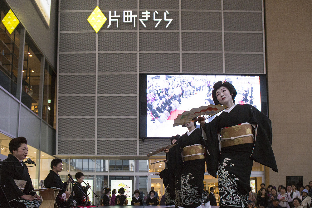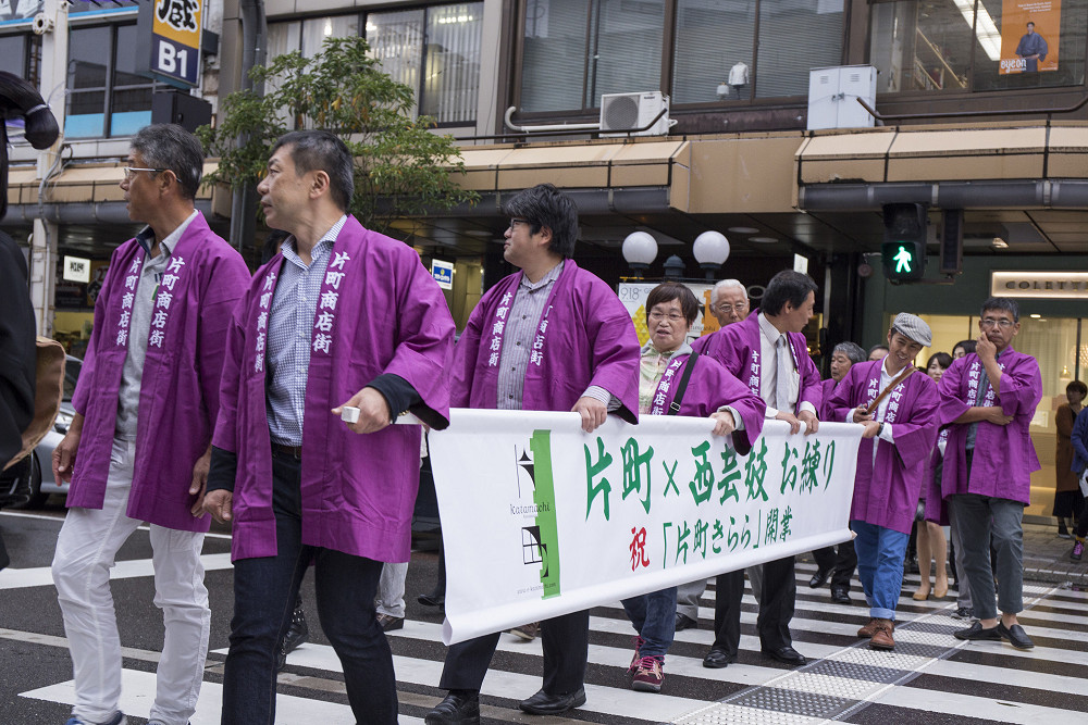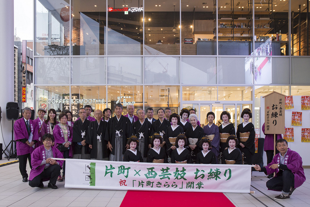 「片町きらら」の開業をお祝いして、広場にて式典、西芸妓衆による伝統芸能披露の後、片町商店街を華やかに練り歩きました。