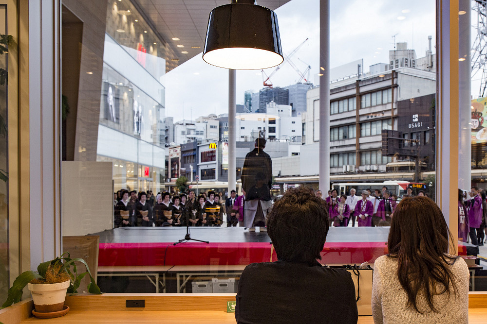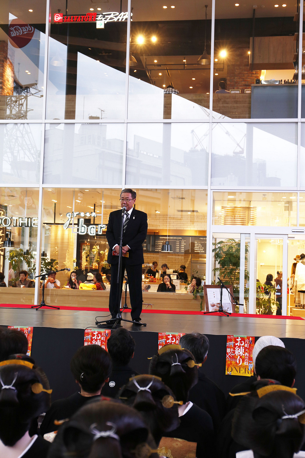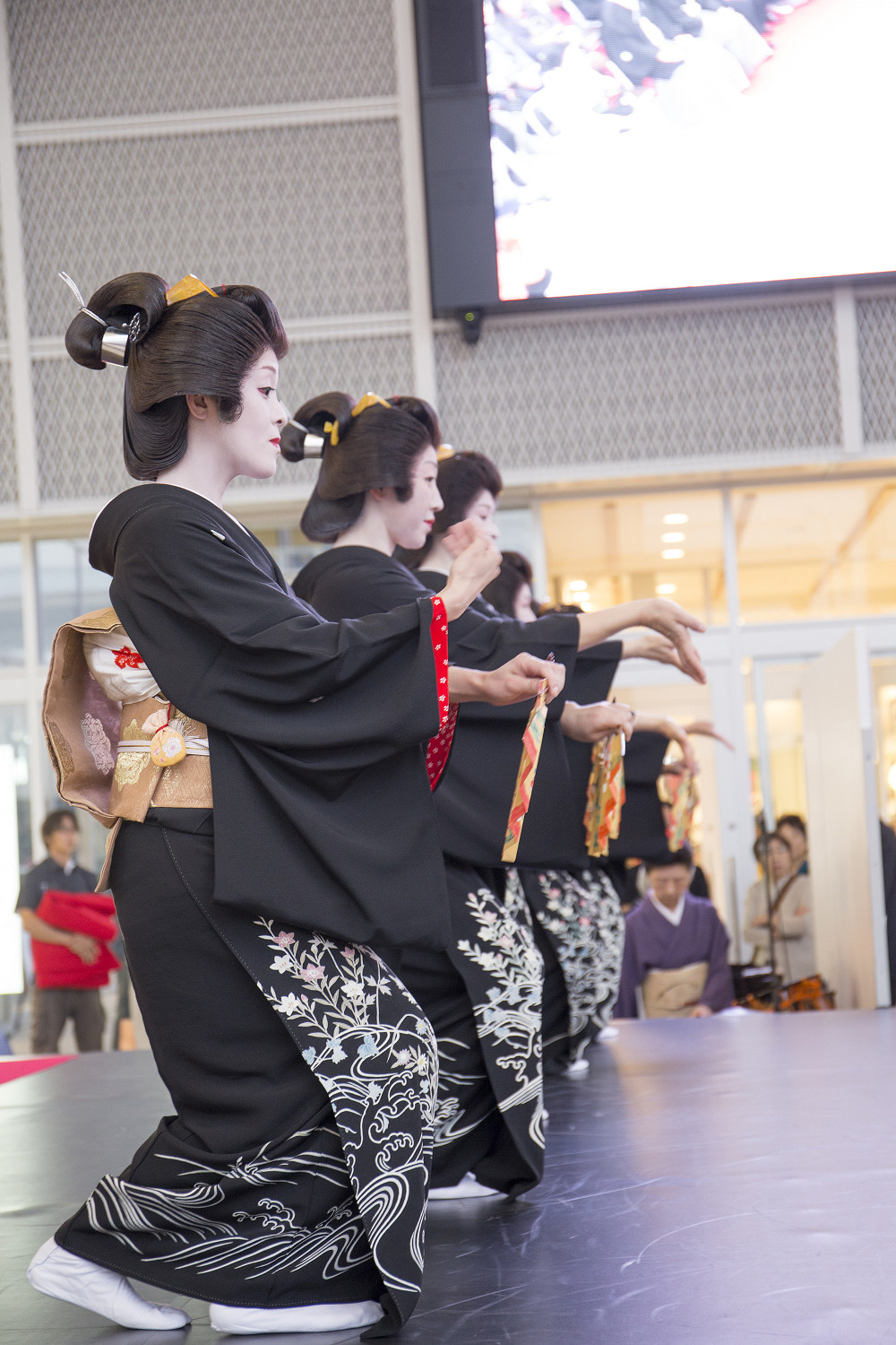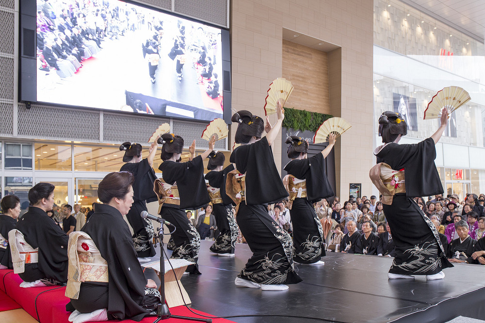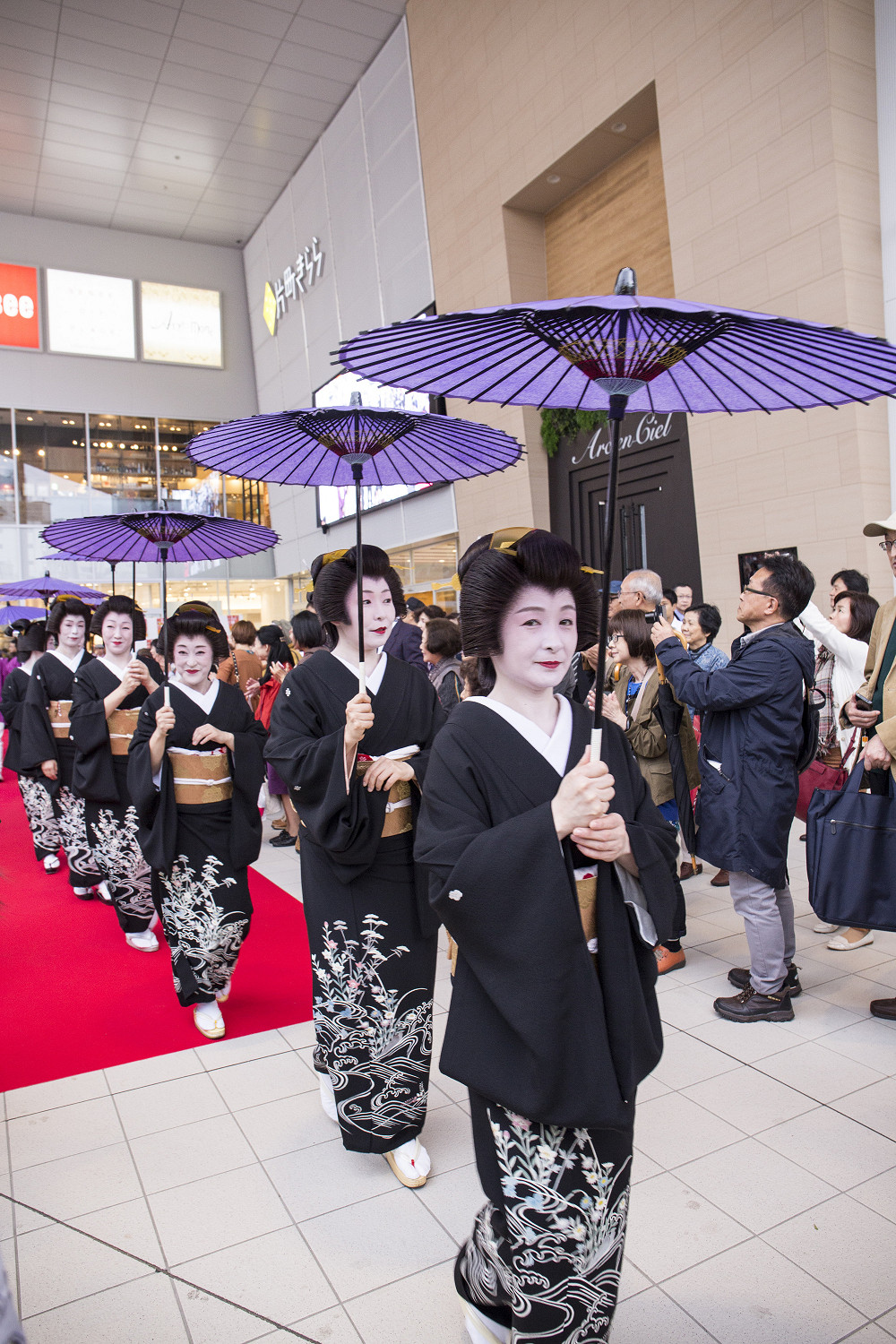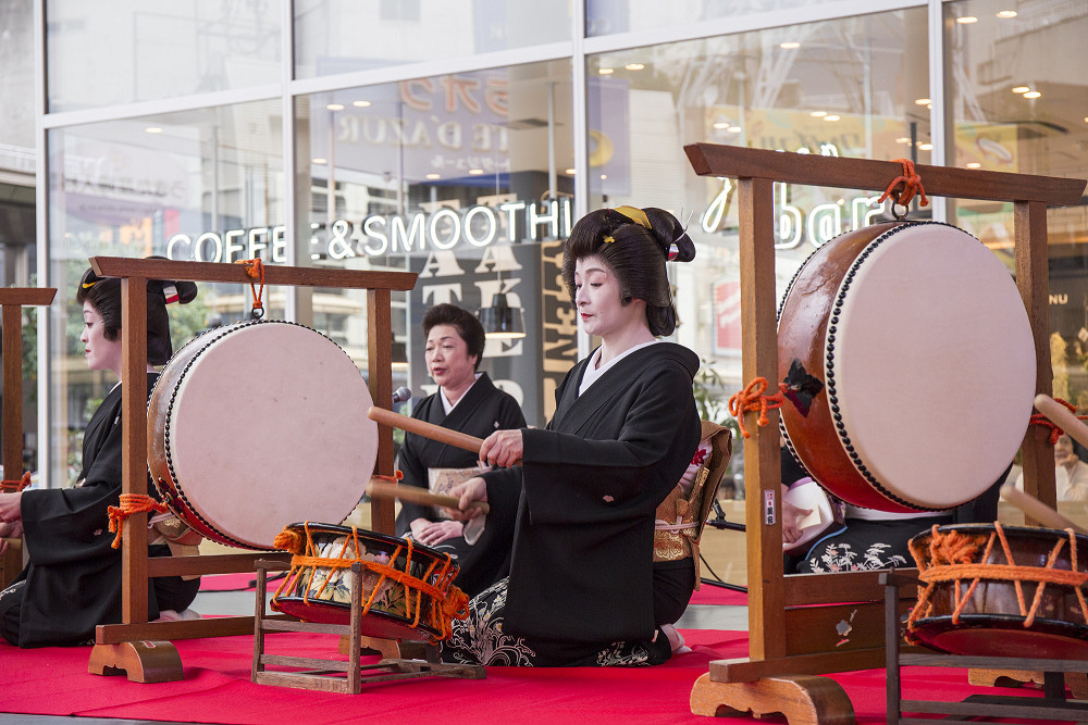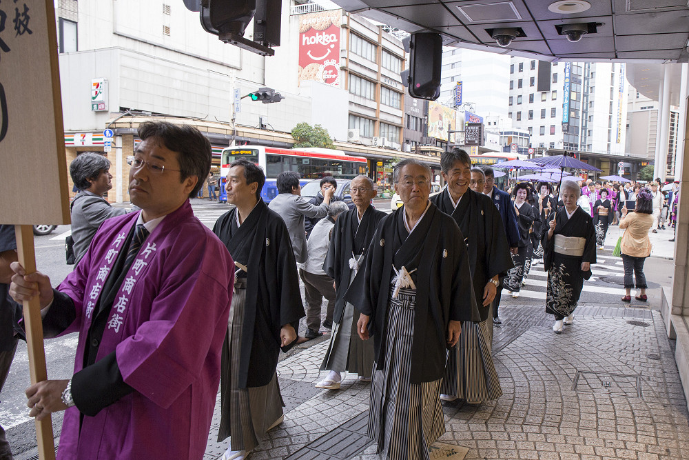 「片町きらら」の開業をお祝いして、広場にて式典、西芸妓衆による伝統芸能披露の後、片町商店街を華やかに練り歩きました。