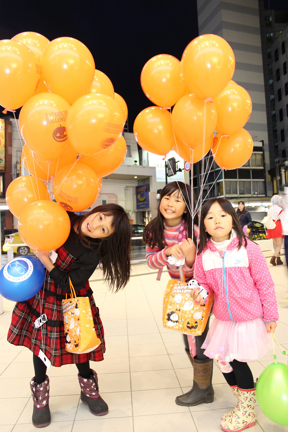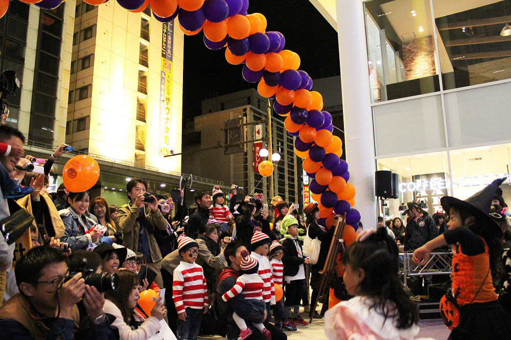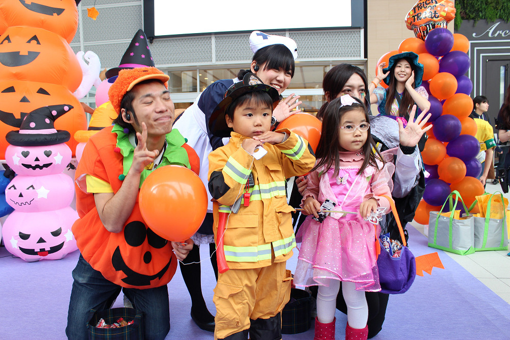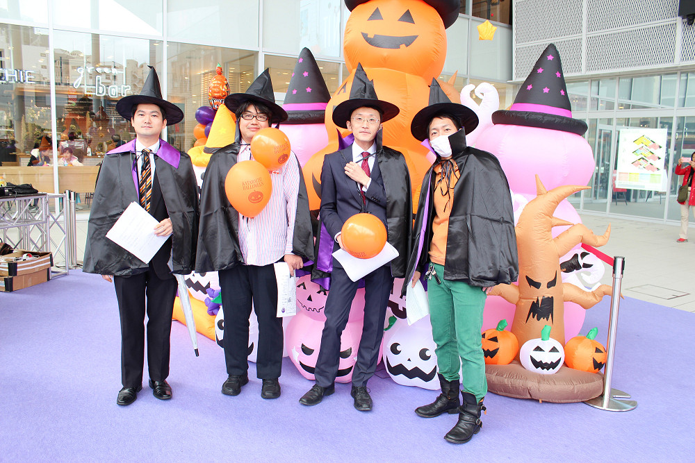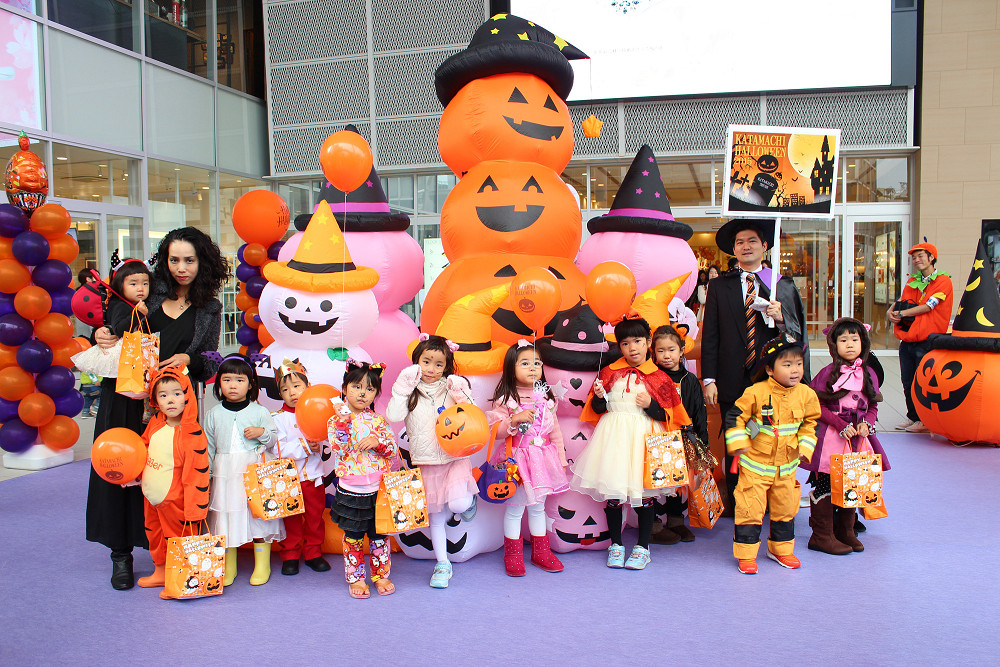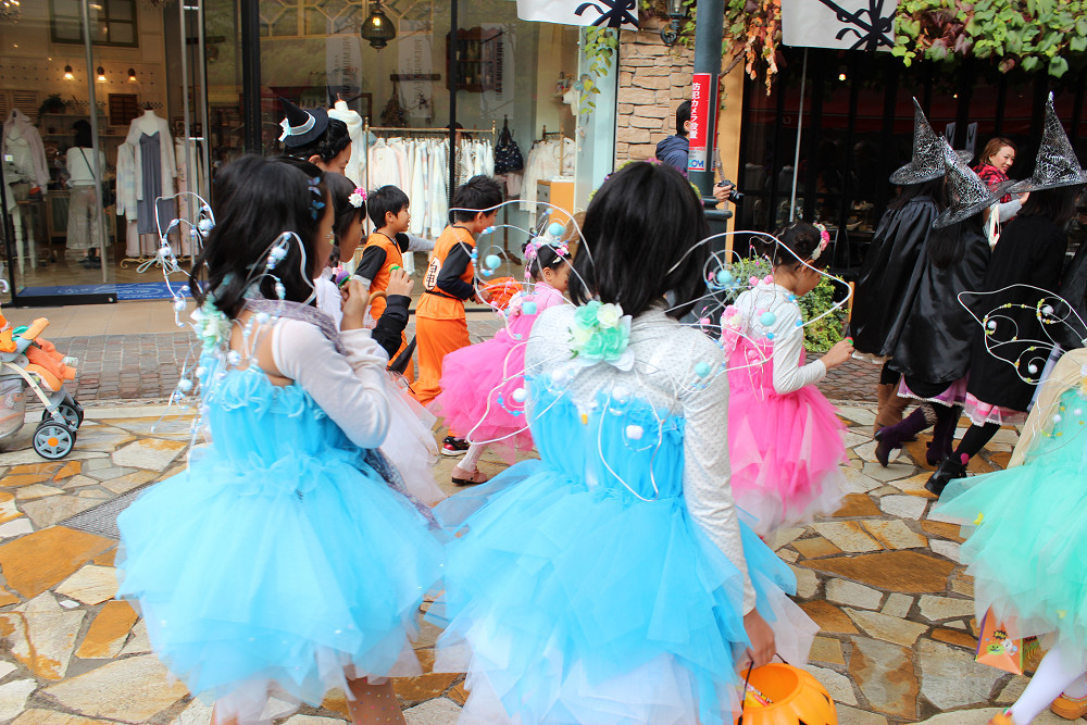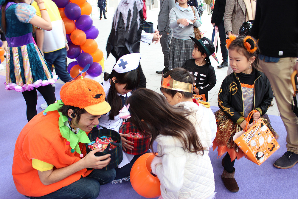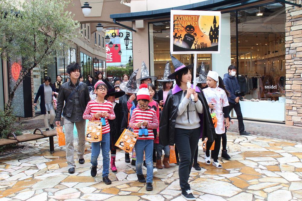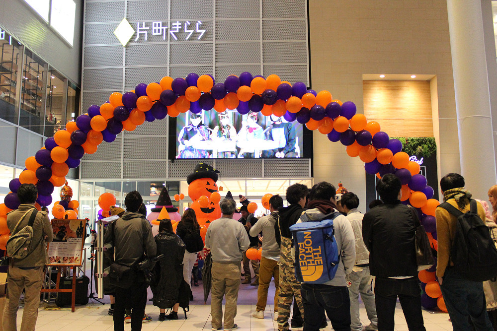 今年のハロウィンは土曜日ということもあり、多くの仮装の方で賑わう中、「片町きらら」の広場をメイン会場とし、イベントを開催しました。昼は仮装をした子どもたちが「trick or treat!」を合言葉に商店街を歩く「ちびっこ仮装パレード」。片町きらら3Fの金沢ロフトさんにもご協力をいただき、仮装をしたスタッフのみなさんが子どもたちにお菓子のプレゼントをしてくれました。