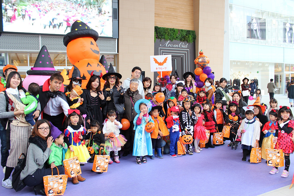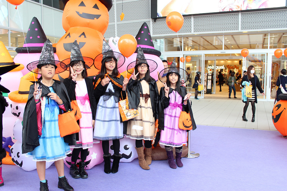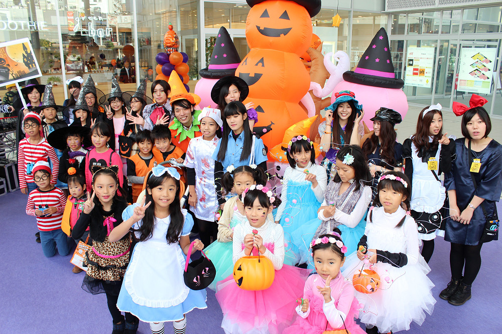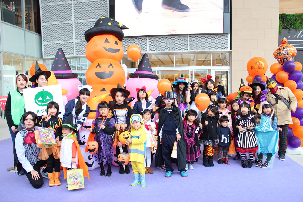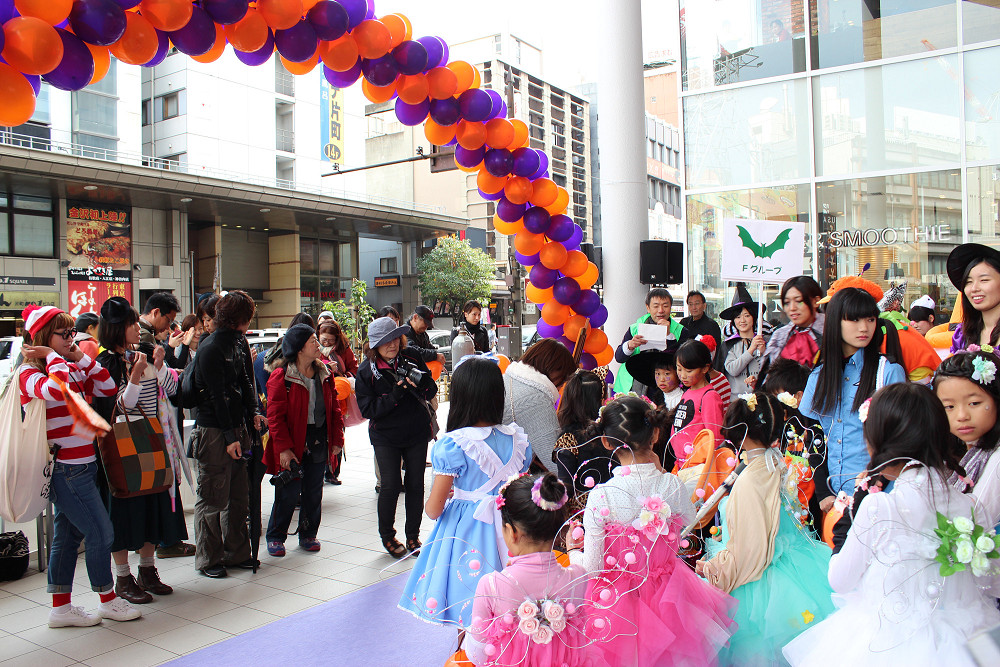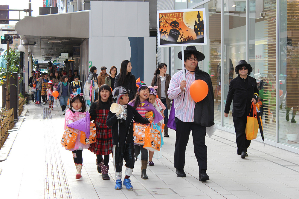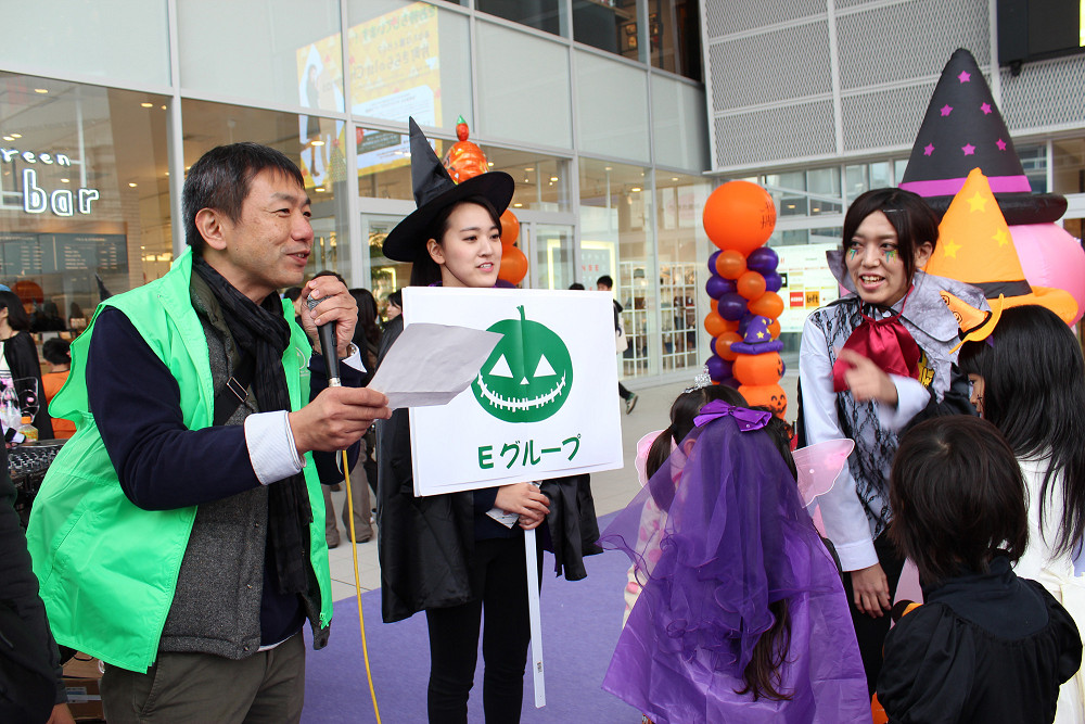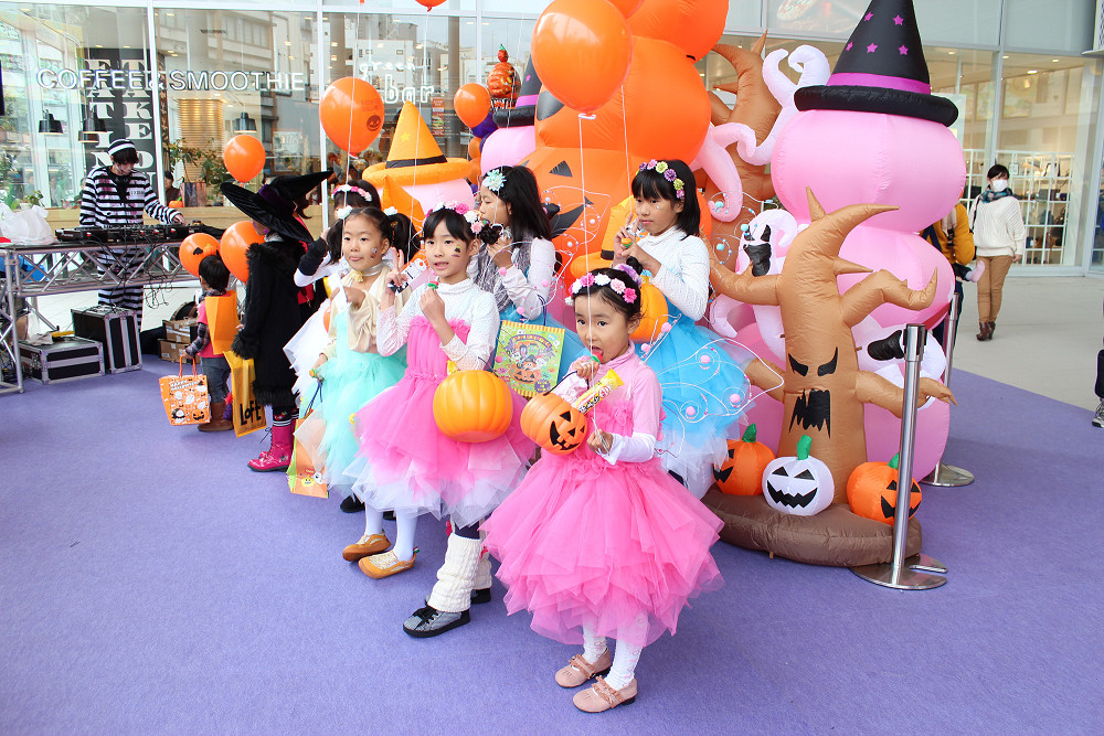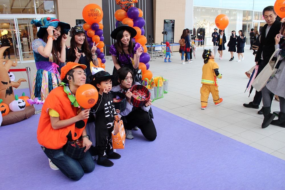 今年のハロウィンは土曜日ということもあり、多くの仮装の方で賑わう中、「片町きらら」の広場をメイン会場とし、イベントを開催しました。昼は仮装をした子どもたちが「trick or treat!」を合言葉に商店街を歩く「ちびっこ仮装パレード」。片町きらら3Fの金沢ロフトさんにもご協力をいただき、仮装をしたスタッフのみなさんが子どもたちにお菓子のプレゼントをしてくれました。