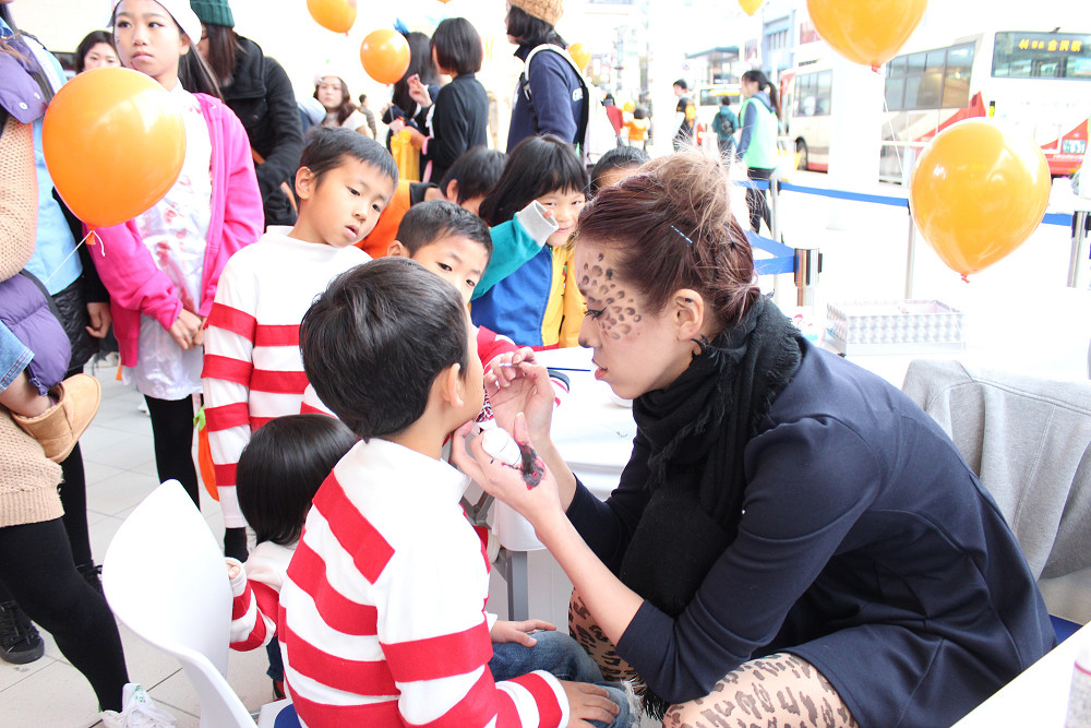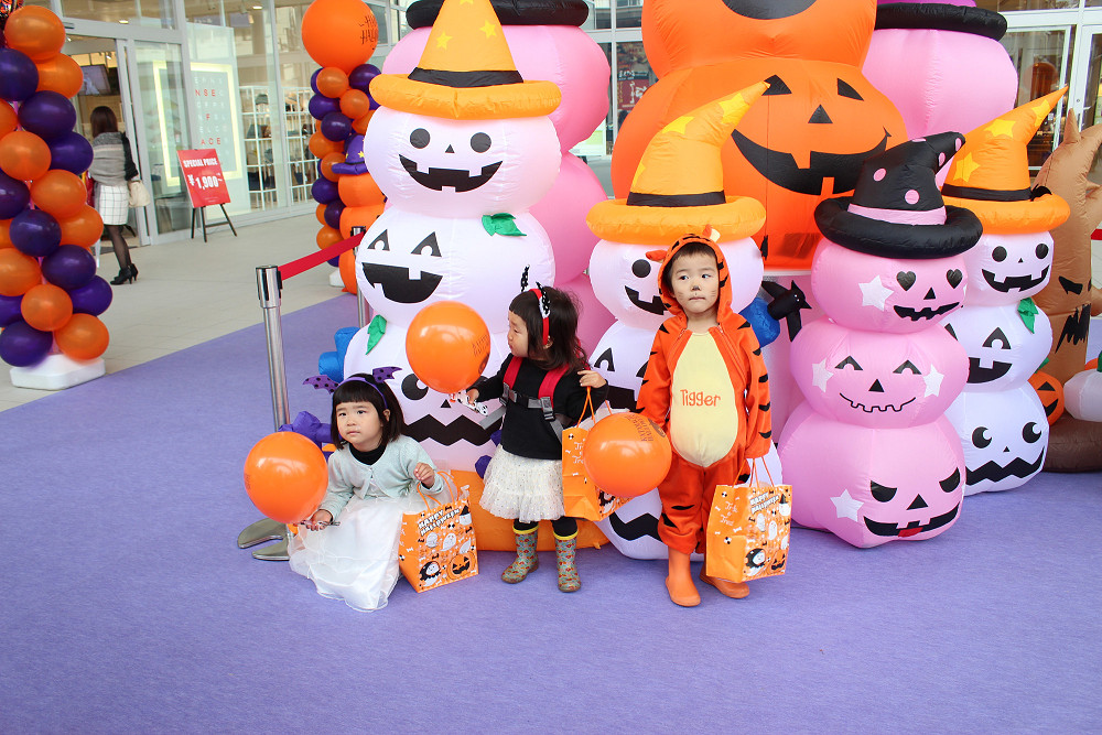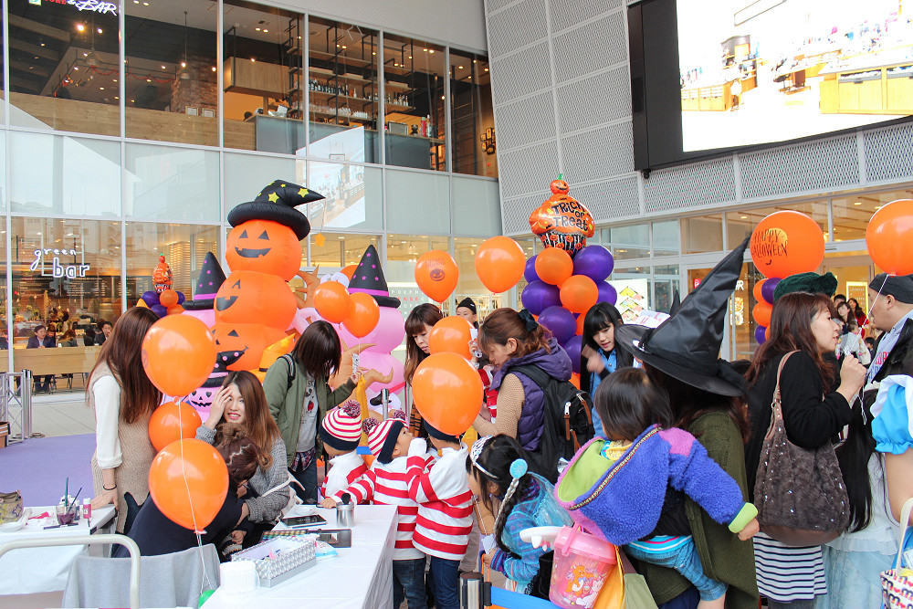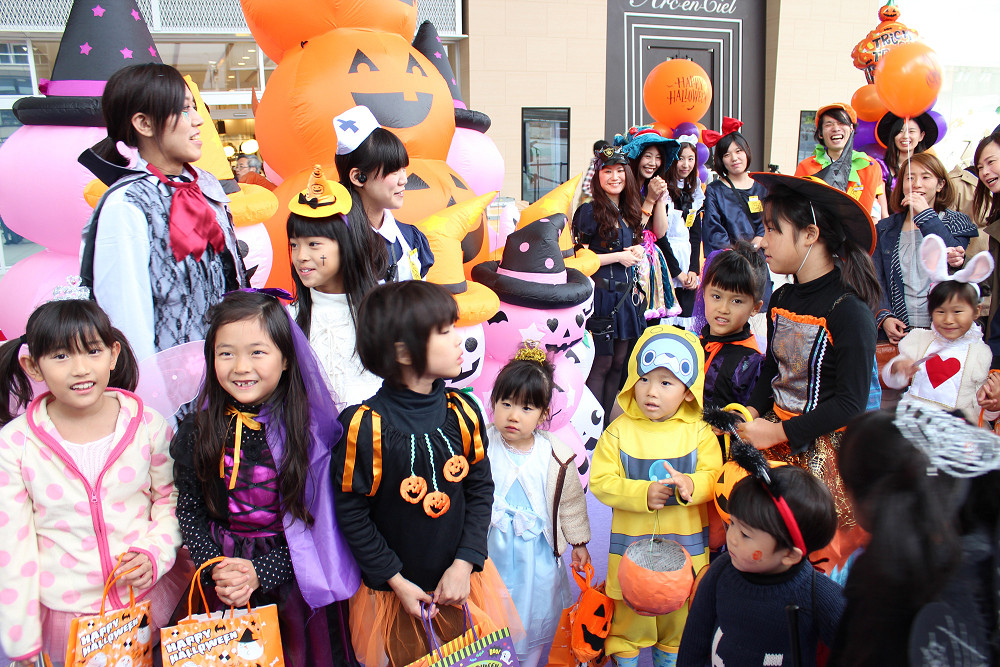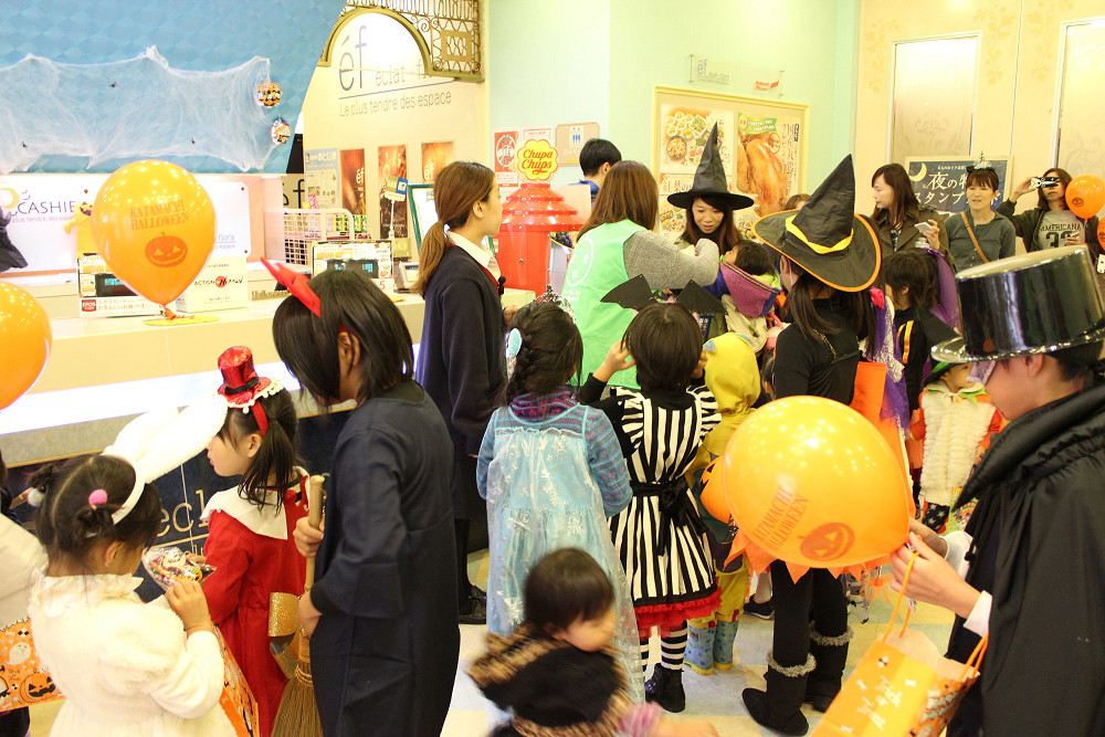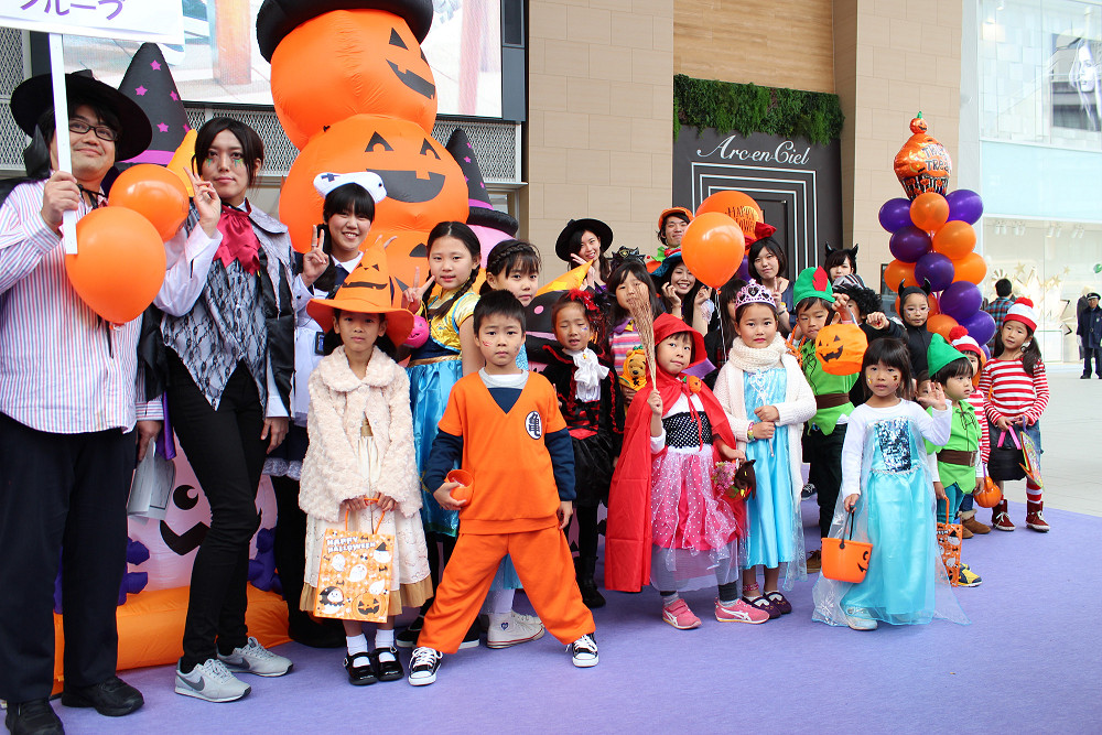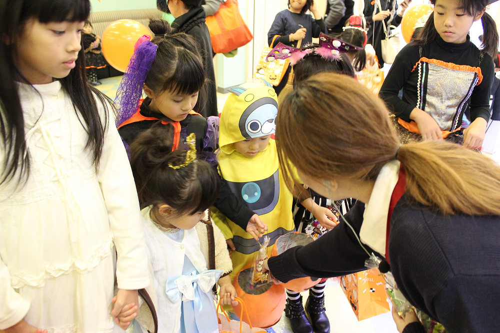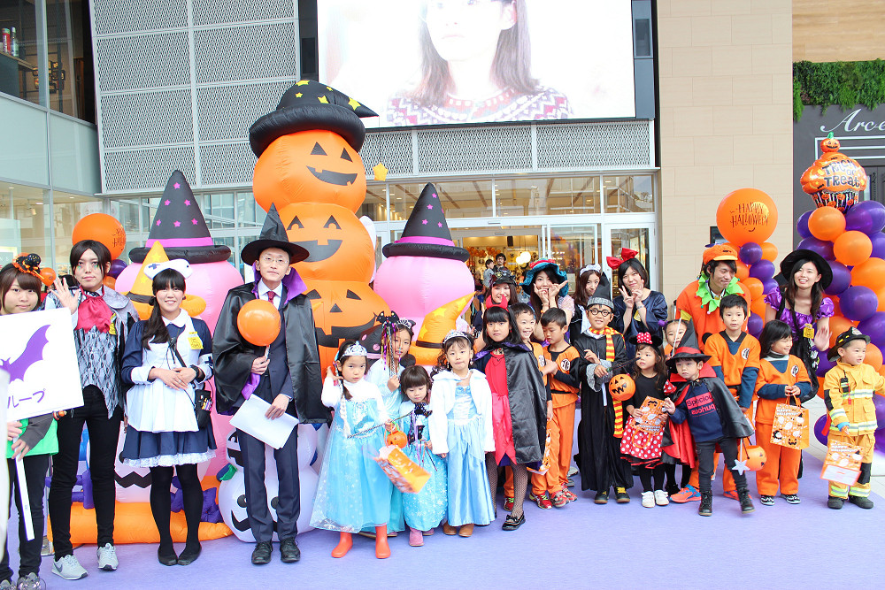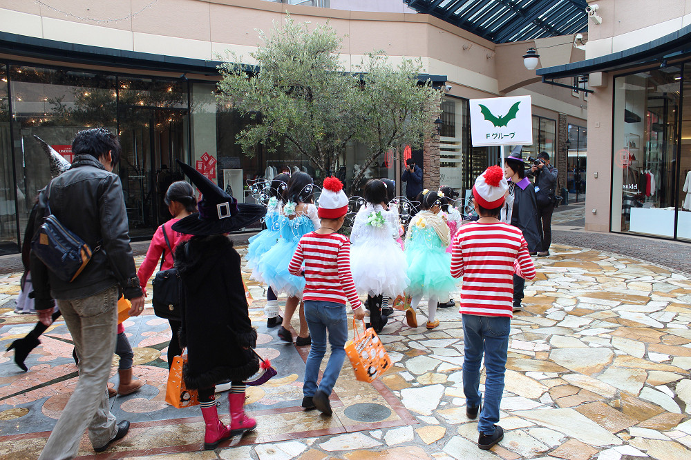 今年のハロウィンは土曜日ということもあり、多くの仮装の方で賑わう中、「片町きらら」の広場をメイン会場とし、イベントを開催しました。昼は仮装をした子どもたちが「trick or treat!」を合言葉に商店街を歩く「ちびっこ仮装パレード」。片町きらら3Fの金沢ロフトさんにもご協力をいただき、仮装をしたスタッフのみなさんが子どもたちにお菓子のプレゼントをしてくれました。