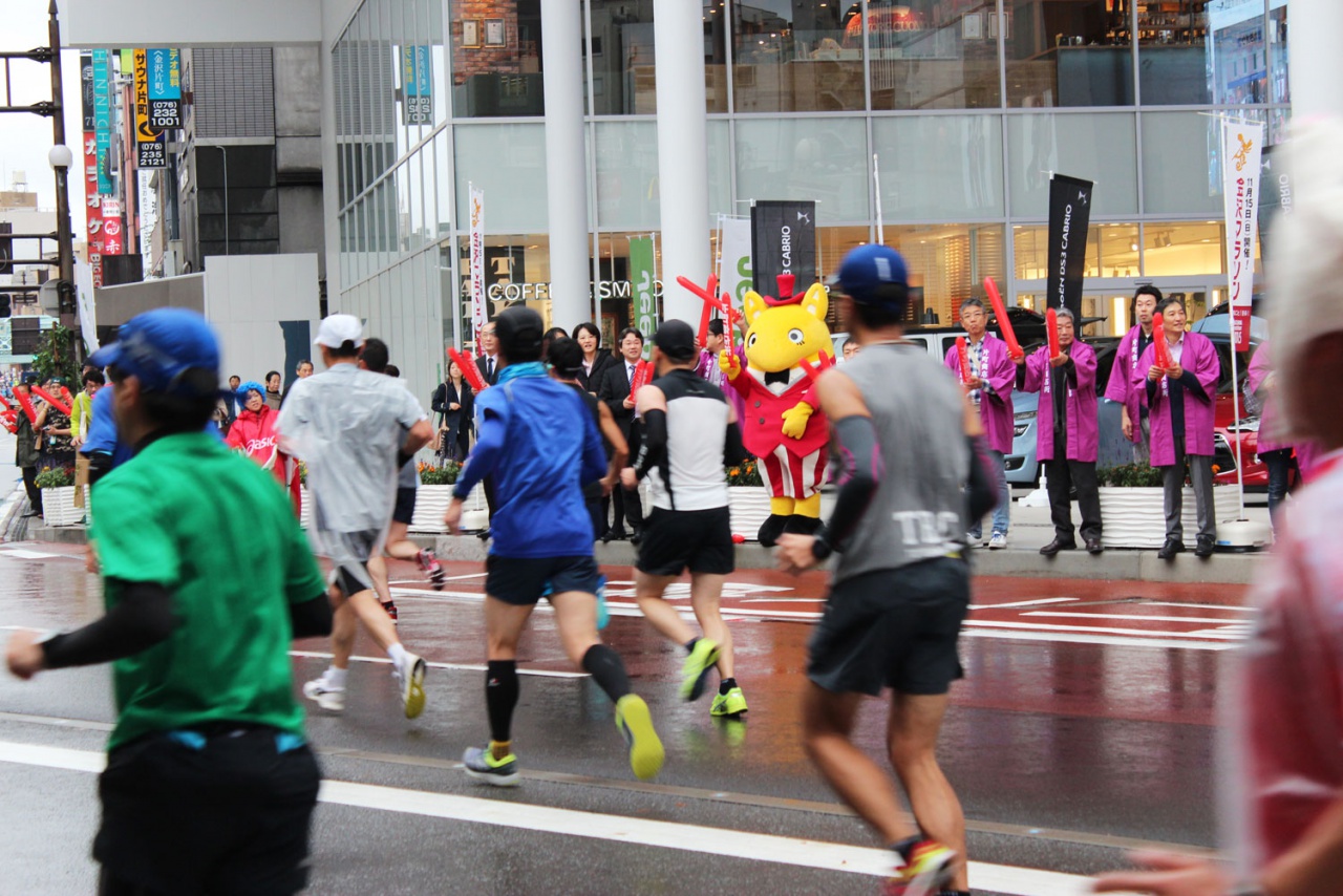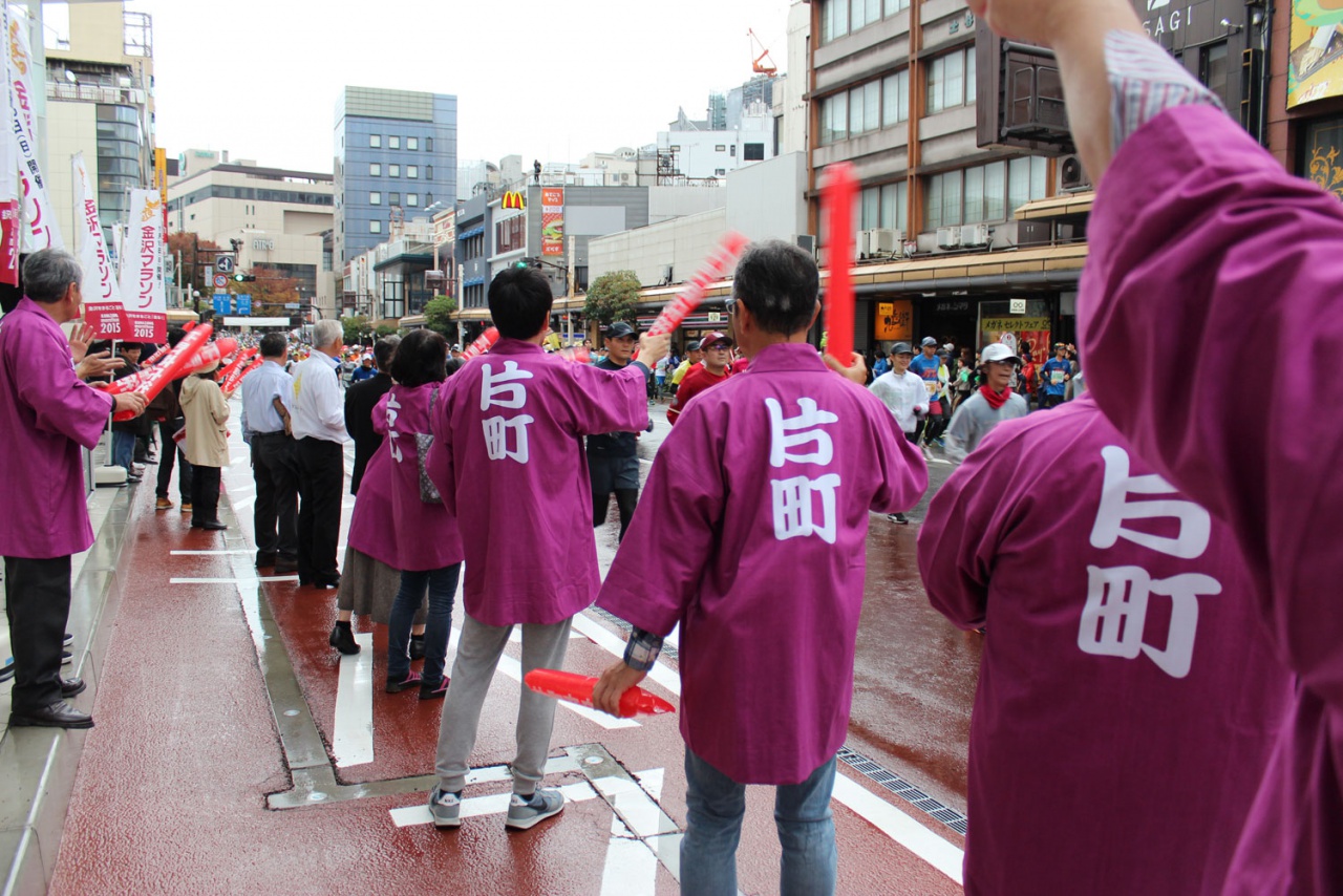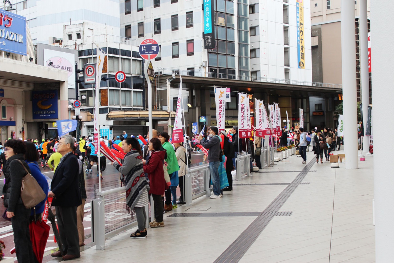 片町の大通りはマラソンルート約5キロ地点となっており、ランナーが通過することから、片町商店街では「沿道にぎやかし隊」として、横断幕、オリジナルのスティックバルーンを用意して、「片町きらら」前を中心に沿道での応援を行いました。
