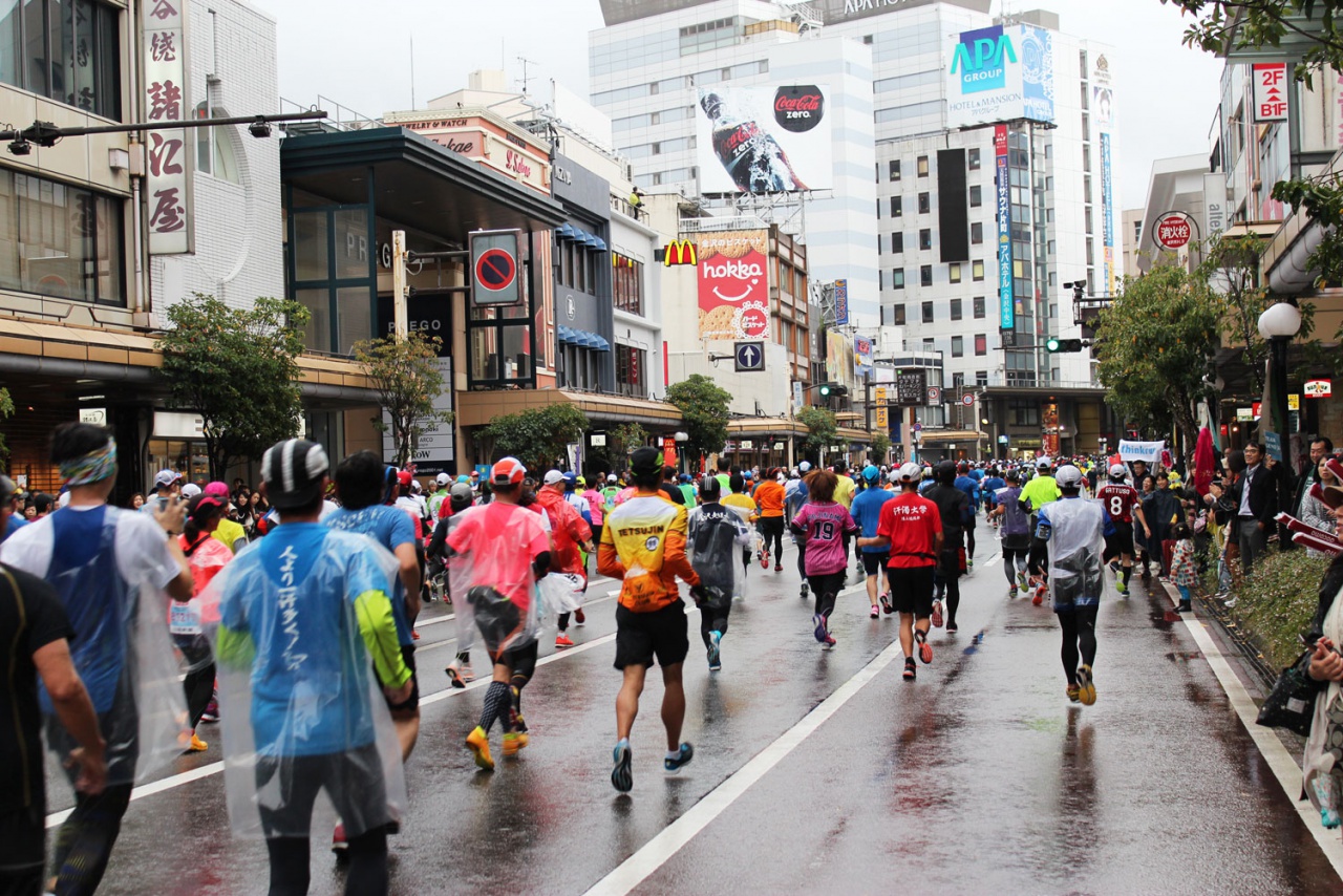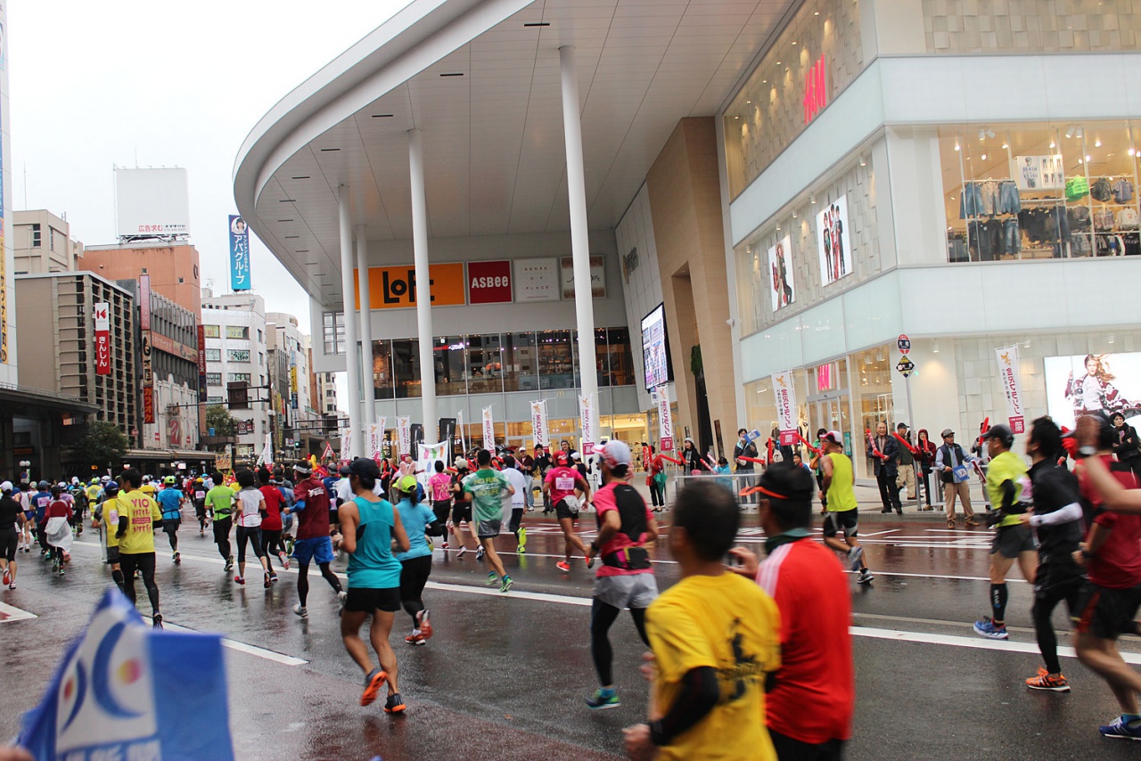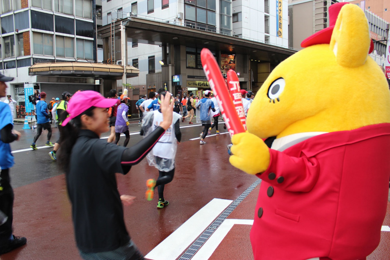 片町の大通りはマラソンルート約5キロ地点となっており、ランナーが通過することから、片町商店街では「沿道にぎやかし隊」として、横断幕、オリジナルのスティックバルーンを用意して、「片町きらら」前を中心に沿道での応援を行いました。