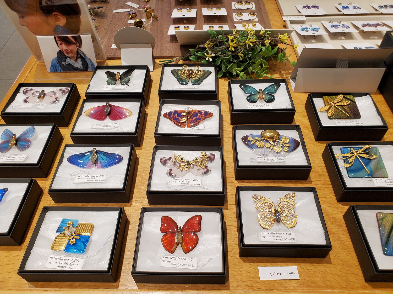 オーナーオリジナルのデザイン、樹脂作品の蝶をモチーフしたアクセサリーやインテリア雑貨の販売。